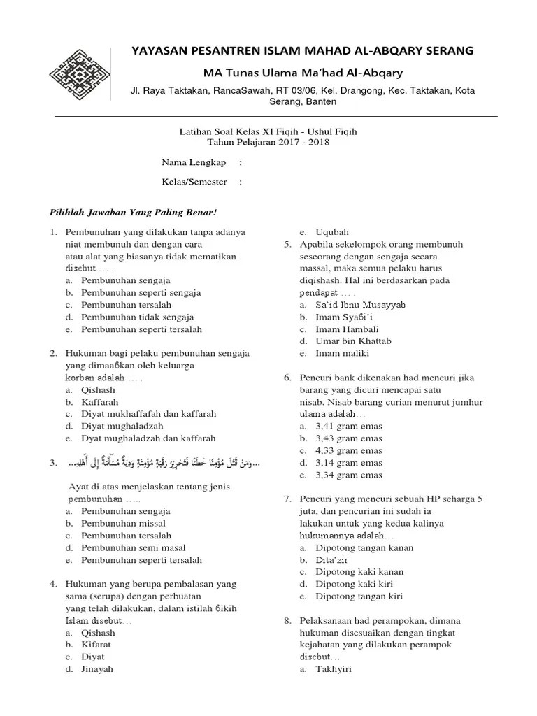 Contoh latihan soal uas / ulangan akhir semester 1 (ganjil) kelas x, xi, xii ma mapel fiqih dan kunci jawaban.