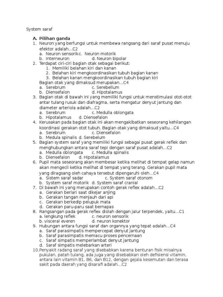 Neuron yang mempunyai peran dan fungsi sebagai . Jawablah soal pilihan ganda berikut dengan memilih salah satu jawaban a, b, c, d, dan e! Biologi kelas 11 sistem saraf pusat dan sistem saraf tepi. Soal biologi kelas 11 sma tentang sistem koordinasi a. Kunci jawaban di bawah soal.